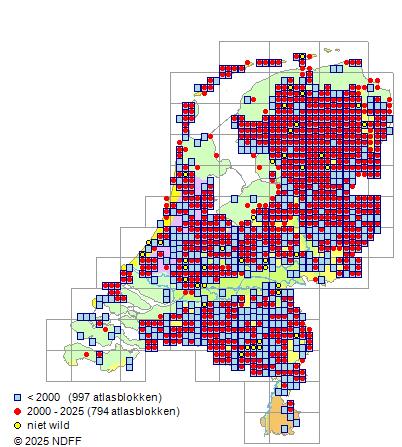 CC BY-NC-SA 3.0 NLVerspreidingNederlandPlaatselijk vrij algemeen in het noordosten van het land, in Noord-Brabant en in Noord-Limburg en vrij zeldzaam in laagveengebieden, in het midden en oosten van het land en op de Waddeneilanden. Elders zeer zeldzaam.