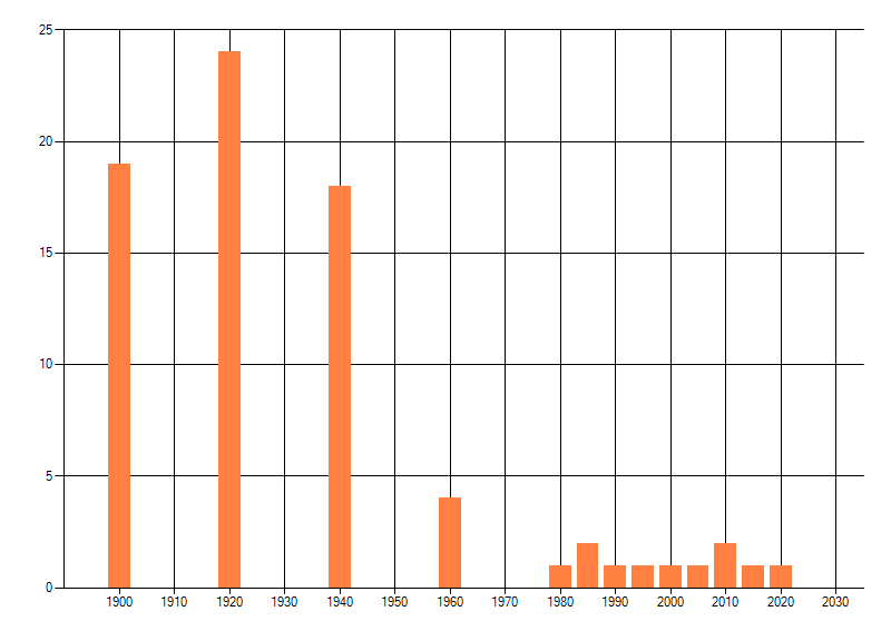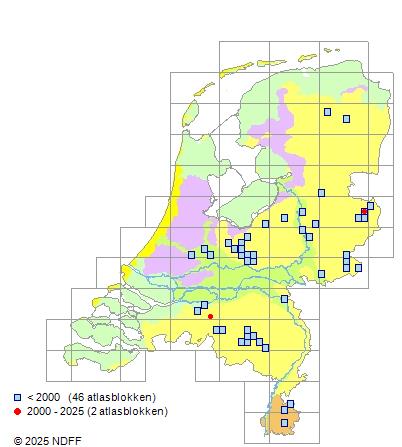 Het aantal atlasblokken (5x5 km) waarin de soort is gemeld binnen een periode van vijf jaar (vanaf 1980) of twintig jaar. Niet gecorrigeerd voor waarnemersinspanning en het aantal doorgegeven waarnemingen kan sterk variëren per periode, dus een trend in verspreiding kan hier niet direct uit worden afgelezen. Het opgegeven jaartal is het eerste jaar van de periode. Bron: gevalideerde waarnemingen uit de NDFF.