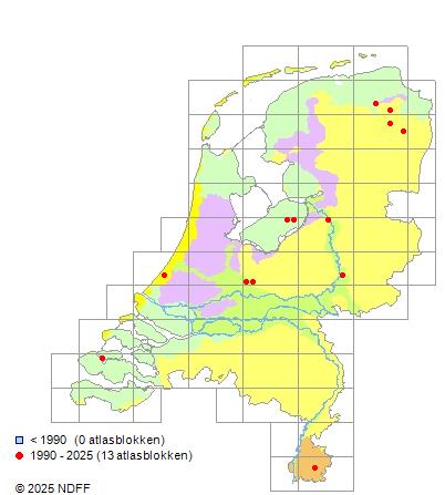 Het aantal atlasblokken (5x5 km) waarin de soort is gemeld binnen een periode van vijf jaar (vanaf 1980) of twintig jaar. Niet gecorrigeerd voor waarnemersinspanning en het aantal doorgegeven waarnemingen kan sterk variëren per periode, dus een trend in verspreiding kan hier niet direct uit worden afgelezen. Het opgegeven jaartal is het eerste jaar van de periode. Bron: gevalideerde waarnemingen uit de NDFF.