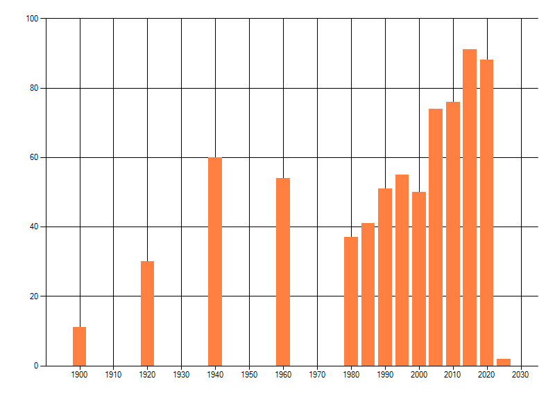 Het aantal atlasblokken (5x5 km) waarin de soort is gemeld binnen een periode van vijf jaar (vanaf 1980) of twintig jaar. Niet gecorrigeerd voor waarnemersinspanning en het aantal doorgegeven waarnemingen kan sterk variëren per periode, dus een trend in verspreiding kan hier niet direct uit worden afgelezen. Het opgegeven jaartal is het eerste jaar van de periode. Bron: gevalideerde waarnemingen uit de NDFF.