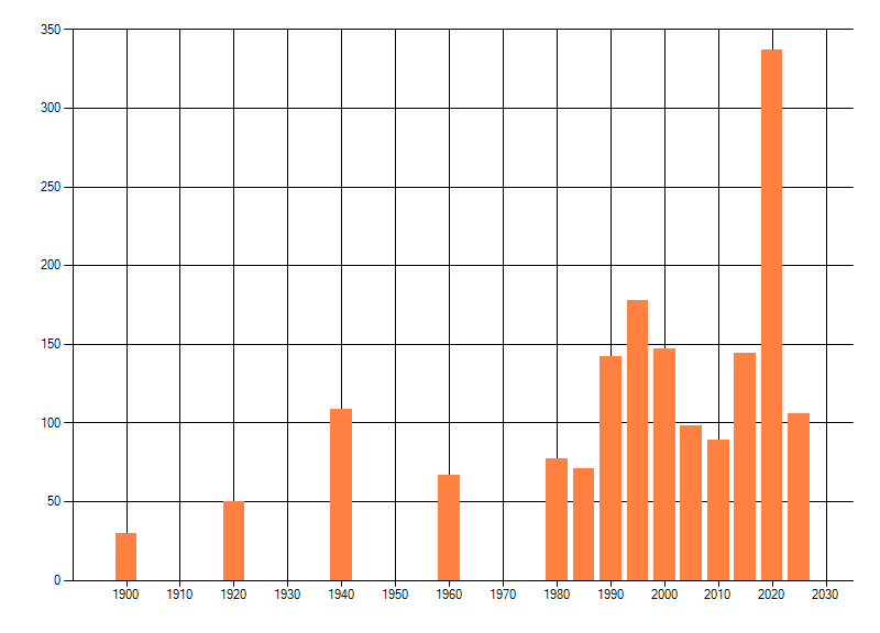 Het aantal atlasblokken (5x5 km) waarin de soort is gemeld binnen een periode van vijf jaar (vanaf 1980) of twintig jaar. Niet gecorrigeerd voor waarnemersinspanning en het aantal doorgegeven waarnemingen kan sterk variëren per periode, dus een trend in verspreiding kan hier niet direct uit worden afgelezen. Het opgegeven jaartal is het eerste jaar van de periode. Bron: gevalideerde waarnemingen uit de NDFF.