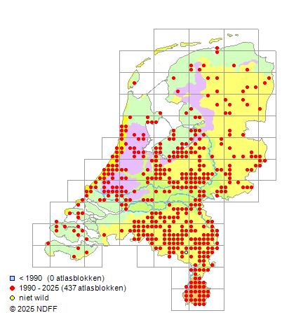 Het aantal atlasblokken (5x5 km) waarin de soort is gemeld binnen een periode van vijf jaar (vanaf 1980) of twintig jaar. Niet gecorrigeerd voor waarnemersinspanning en het aantal doorgegeven waarnemingen kan sterk variëren per periode, dus een trend in verspreiding kan hier niet direct uit worden afgelezen. Het opgegeven jaartal is het eerste jaar van de periode. Bron: gevalideerde waarnemingen uit de NDFF.