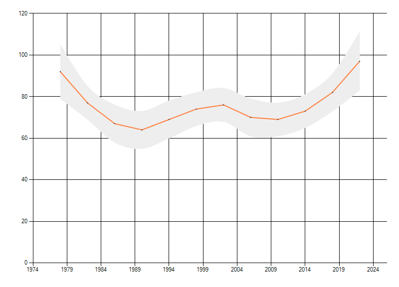 Gemiddelde trend van het aantal kilometerhokken waarin de soort voorkomt, weergegeven als indexcijfer (1975-1978 = 100). De trend is gecorrigeerd voor waarnemersinspanning en geeft de relatieve verandering in het aantal bezette kilometerhokken weer. Voor de berekening worden de data per periode van vier jaar samengenomen. In de grafiek correspondeert ieder punt met het laatste jaar van zo'n periode.