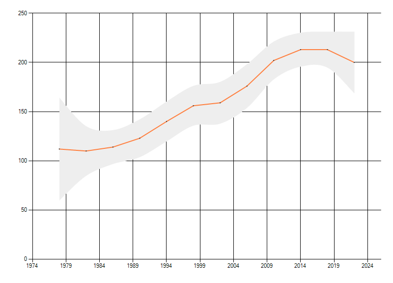 Gemiddelde trend van het aantal kilometerhokken waarin de soort voorkomt, weergegeven als indexcijfer (1975-1978 = 100). De trend is gecorrigeerd voor waarnemersinspanning en geeft de relatieve verandering in het aantal bezette kilometerhokken weer. Voor de berekening worden de data per periode van vier jaar samengenomen. In de grafiek correspondeert ieder punt met het laatste jaar van zo'n periode.