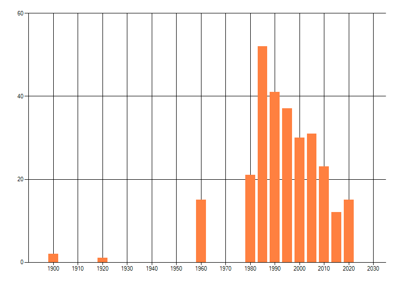 Het aantal atlasblokken (5x5 km) waarin de soort is gemeld binnen een periode van vijf jaar (vanaf 1980) of twintig jaar. Niet gecorrigeerd voor waarnemersinspanning en het aantal doorgegeven waarnemingen kan sterk variëren per periode, dus een trend in verspreiding kan hier niet direct uit worden afgelezen. Het opgegeven jaartal is het eerste jaar van de periode. Bron: gevalideerde waarnemingen uit de NDFF.