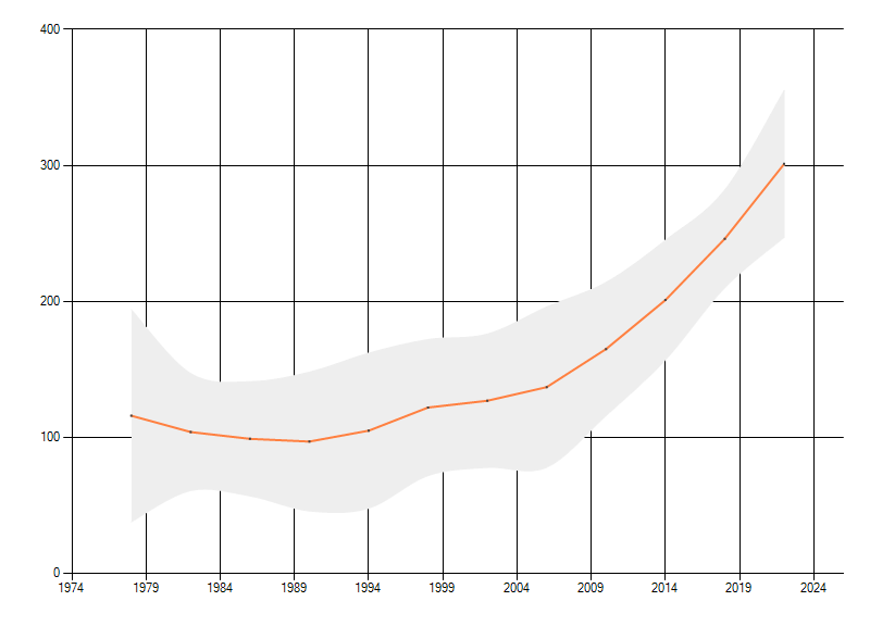 Gemiddelde trend van het aantal kilometerhokken waarin de soort voorkomt, weergegeven als indexcijfer (1975-1978 = 100). De trend is gecorrigeerd voor waarnemersinspanning en geeft de relatieve verandering in het aantal bezette kilometerhokken weer. Voor de berekening worden de data per periode van vier jaar samengenomen. In de grafiek correspondeert ieder punt met het laatste jaar van zo'n periode.