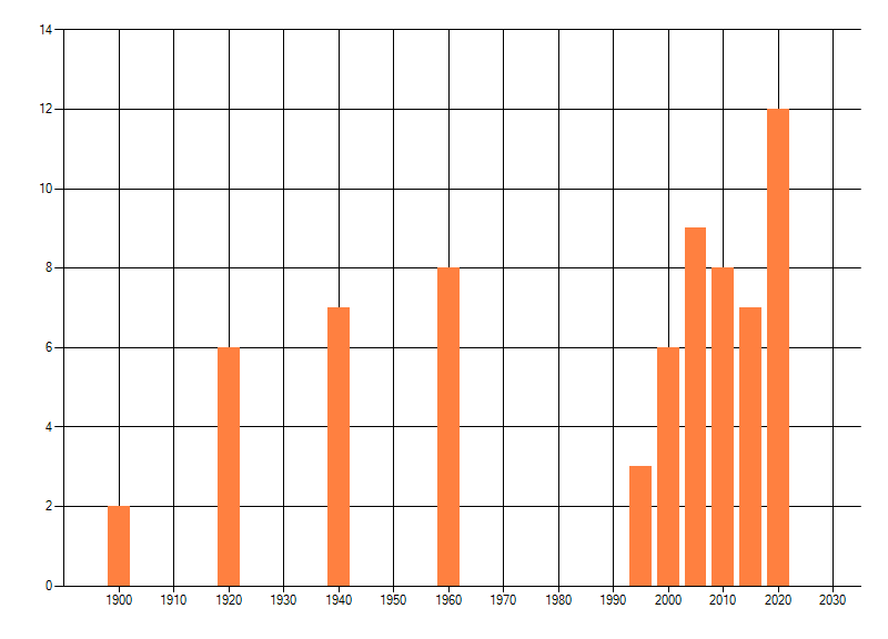 Het aantal atlasblokken (5x5 km) waarin de soort is gemeld binnen een periode van vijf jaar (vanaf 1980) of twintig jaar. Niet gecorrigeerd voor waarnemersinspanning en het aantal doorgegeven waarnemingen kan sterk variëren per periode, dus een trend in verspreiding kan hier niet direct uit worden afgelezen. Het opgegeven jaartal is het eerste jaar van de periode. Bron: gevalideerde waarnemingen uit de NDFF.
