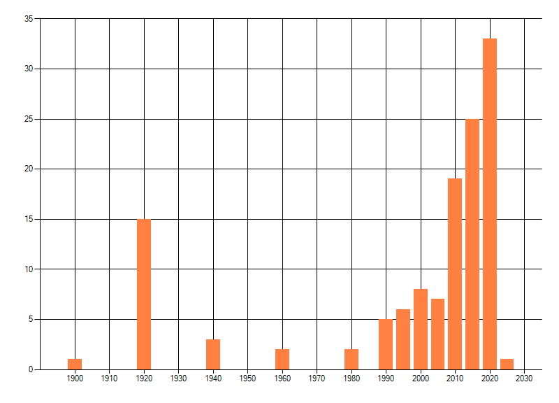 Het aantal atlasblokken (5x5 km) waarin de soort is gemeld binnen een periode van vijf jaar (vanaf 1980) of twintig jaar. Niet gecorrigeerd voor waarnemersinspanning en het aantal doorgegeven waarnemingen kan sterk variëren per periode, dus een trend in verspreiding kan hier niet direct uit worden afgelezen. Het opgegeven jaartal is het eerste jaar van de periode. Bron: gevalideerde waarnemingen uit de NDFF.
