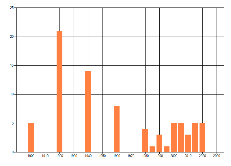 Het aantal atlasblokken (5x5 km) waarin de soort is gemeld binnen een periode van vijf jaar (vanaf 1980) of twintig jaar. Niet gecorrigeerd voor waarnemersinspanning en het aantal doorgegeven waarnemingen kan sterk variëren per periode, dus een trend in verspreiding kan hier niet direct uit worden afgelezen. Het opgegeven jaartal is het eerste jaar van de periode. Bron: gevalideerde waarnemingen uit de NDFF.