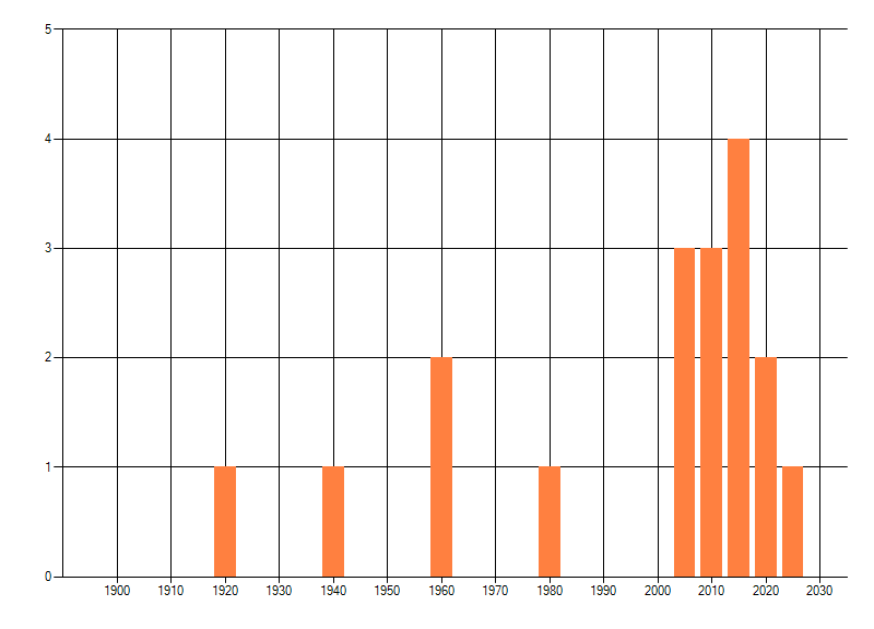 Het aantal atlasblokken (5x5 km) waarin de soort is gemeld binnen een periode van vijf jaar (vanaf 1980) of twintig jaar. Niet gecorrigeerd voor waarnemersinspanning en het aantal doorgegeven waarnemingen kan sterk variëren per periode, dus een trend in verspreiding kan hier niet direct uit worden afgelezen. Het opgegeven jaartal is het eerste jaar van de periode. Bron: gevalideerde waarnemingen uit de NDFF.