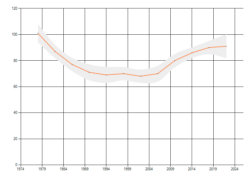 Gemiddelde trend van het aantal kilometerhokken waarin de soort voorkomt, weergegeven als indexcijfer (1975-1978 = 100).