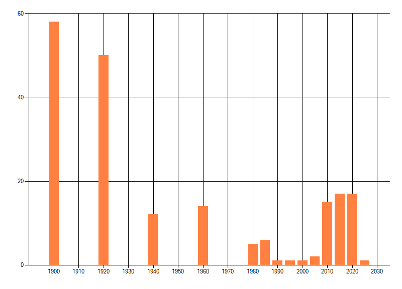 Het aantal atlasblokken (5x5 km) waarin de soort is gemeld binnen een periode van vijf jaar (vanaf 1980) of twintig jaar. Niet gecorrigeerd voor waarnemersinspanning en het aantal doorgegeven waarnemingen kan sterk variëren per periode, dus een trend in verspreiding kan hier niet direct uit worden afgelezen. Het opgegeven jaartal is het eerste jaar van de periode. Bron: gevalideerde waarnemingen uit de NDFF.