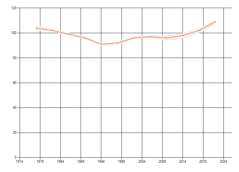 Gemiddelde trend van het aantal kilometerhokken waarin de soort voorkomt, weergegeven als indexcijfer (1975-1978 = 100).