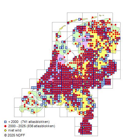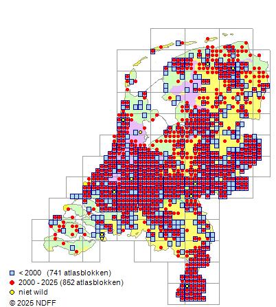 CC BY-NC-SA 3.0 NLVerspreidingNederlandVrij algemeen, maar vrij zeldzaam in Noord-Brabant en Noord-Limburg, in Gelderland, in delen van Overijssel en in het noorden van het land en zeer zeldzaam op de Waddeneilanden, in het noordelijk zeekleigebied, in Flevoland en in Zeeland.