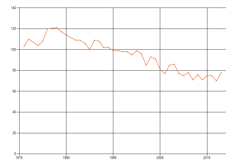 Gemiddelde trend van het aantal kilometerhokken waarin de soort voorkomt, weergegeven als indexcijfer (1975-1978 = 100). De trend is gecorrigeerd voor waarnemersinspanning en geeft de relatieve verandering in het aantal bezette kilometerhokken weer. Voor de berekening worden de data per periode van vier jaar samengenomen. In de grafiek correspondeert ieder punt met het laatste jaar van zo'n periode.