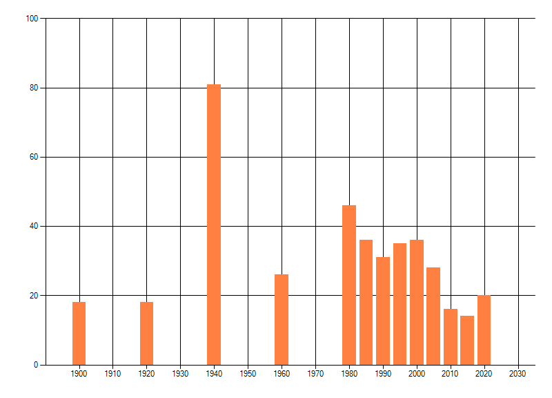 Het aantal atlasblokken (5x5 km) waarin de soort is gemeld binnen een periode van vijf jaar (vanaf 1980) of twintig jaar. Niet gecorrigeerd voor waarnemersinspanning en het aantal doorgegeven waarnemingen kan sterk variëren per periode, dus een trend in verspreiding kan hier niet direct uit worden afgelezen. Het opgegeven jaartal is het eerste jaar van de periode. Bron: gevalideerde waarnemingen uit de NDFF.