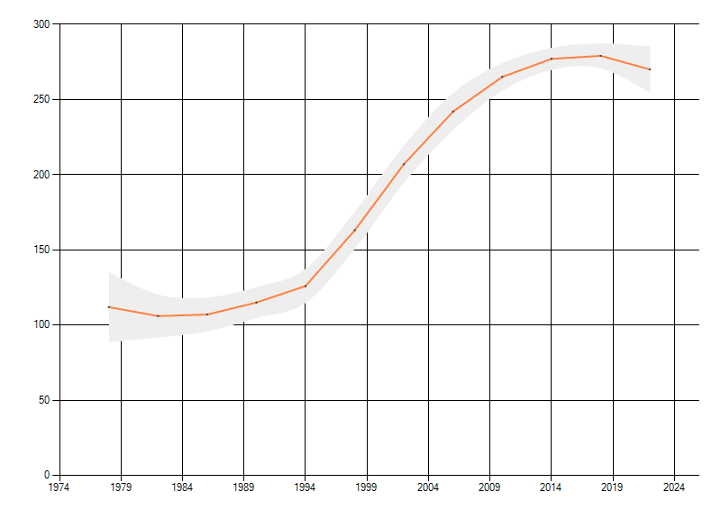Gemiddelde trend van het aantal kilometerhokken waarin de soort voorkomt, weergegeven als indexcijfer (1975-1978 = 100).