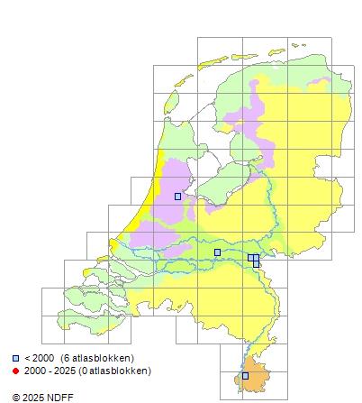 Het aantal atlasblokken (5x5 km) waarin de soort is gemeld binnen een periode van vijf jaar (vanaf 1980) of twintig jaar. Niet gecorrigeerd voor waarnemersinspanning en het aantal doorgegeven waarnemingen kan sterk variëren per periode, dus een trend in verspreiding kan hier niet direct uit worden afgelezen. Het opgegeven jaartal is het eerste jaar van de periode. Bron: gevalideerde waarnemingen uit de NDFF.