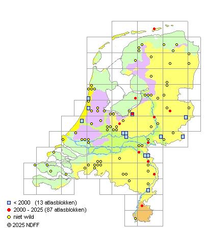 Het aantal atlasblokken (5x5 km) waarin de soort is gemeld binnen een periode van vijf jaar (vanaf 1980) of twintig jaar. Niet gecorrigeerd voor waarnemersinspanning en het aantal doorgegeven waarnemingen kan sterk variëren per periode, dus een trend in verspreiding kan hier niet direct uit worden afgelezen. Het opgegeven jaartal is het eerste jaar van de periode. Bron: gevalideerde waarnemingen uit de NDFF.