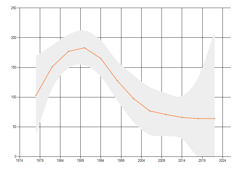 Gemiddelde trend van het aantal kilometerhokken waarin de soort voorkomt, weergegeven als indexcijfer (1975-1978 = 100).