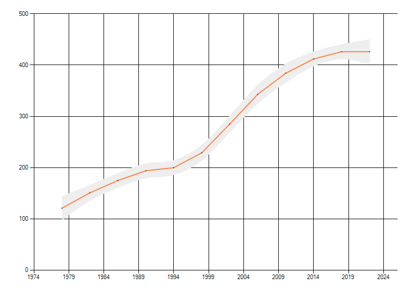 Gemiddelde trend van het aantal kilometerhokken waarin de soort voorkomt, weergegeven als indexcijfer (1975-1978 = 100).