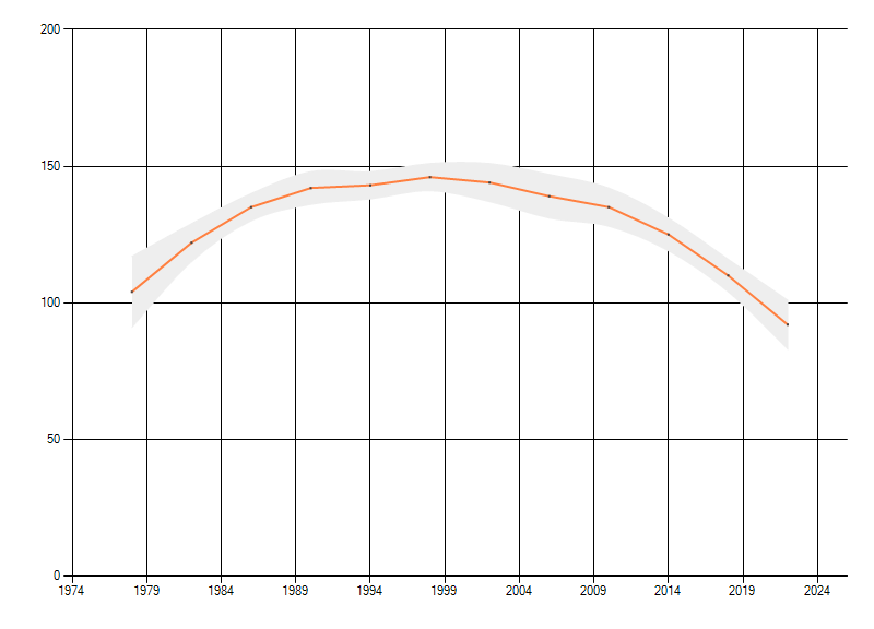 Gemiddelde trend van het aantal kilometerhokken waarin de soort voorkomt, weergegeven als indexcijfer (1975-1978 = 100). De trend is gecorrigeerd voor waarnemersinspanning en geeft de relatieve verandering in het aantal bezette kilometerhokken weer. Voor de berekening worden de data per periode van vier jaar samengenomen. In de grafiek correspondeert ieder punt met het laatste jaar van zo'n periode.