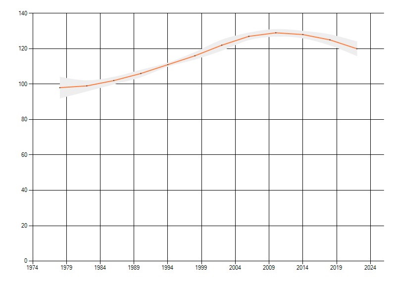Gemiddelde trend van het aantal kilometerhokken waarin de soort voorkomt, weergegeven als indexcijfer (1975-1978 = 100).
