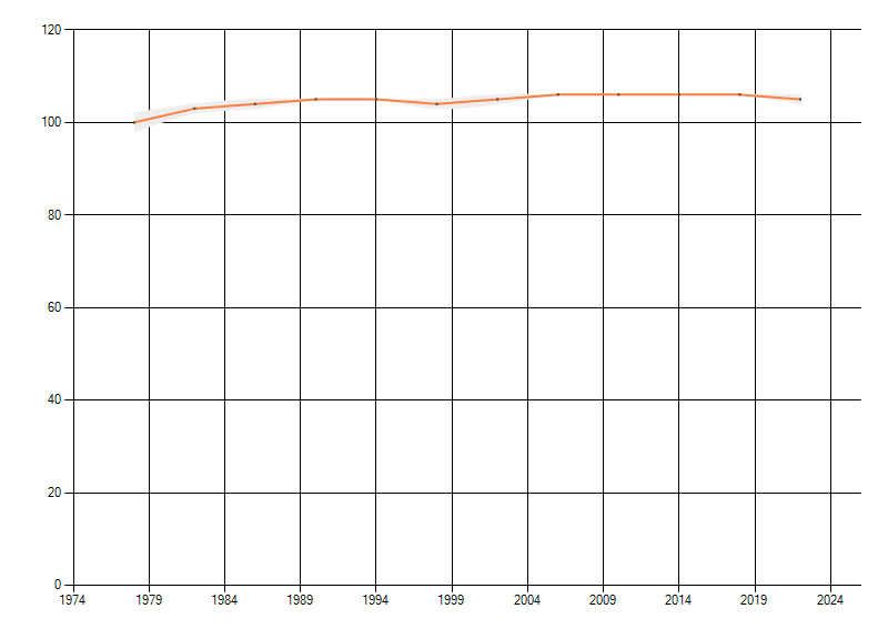 Gemiddelde trend van het aantal kilometerhokken waarin de soort voorkomt, weergegeven als indexcijfer (1975-1978 = 100).