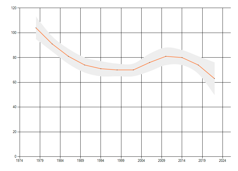 Gemiddelde trend van het aantal kilometerhokken waarin de soort voorkomt, weergegeven als indexcijfer (1975-1978 = 100).