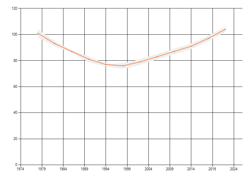 Gemiddelde trend van het aantal kilometerhokken waarin de soort voorkomt, weergegeven als indexcijfer (1975-1978 = 100).