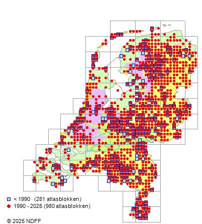 Het aantal atlasblokken (5x5 km) waarin de soort is gemeld binnen een periode van vijf jaar (vanaf 1980) of twintig jaar. Niet gecorrigeerd voor waarnemersinspanning en het aantal doorgegeven waarnemingen kan sterk variëren per periode, dus een trend in verspreiding kan hier niet direct uit worden afgelezen. Het opgegeven jaartal is het eerste jaar van de periode. Bron: gevalideerde waarnemingen uit de NDFF.