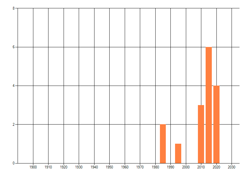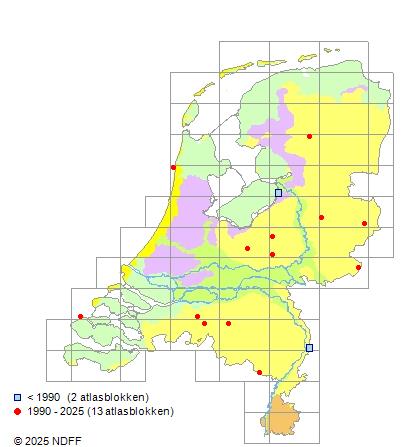 Het aantal atlasblokken (5x5 km) waarin de soort is gemeld binnen een periode van vijf jaar (vanaf 1980) of twintig jaar. Niet gecorrigeerd voor waarnemersinspanning en het aantal doorgegeven waarnemingen kan sterk variëren per periode, dus een trend in verspreiding kan hier niet direct uit worden afgelezen. Het opgegeven jaartal is het eerste jaar van de periode. Bron: gevalideerde waarnemingen uit de NDFF.