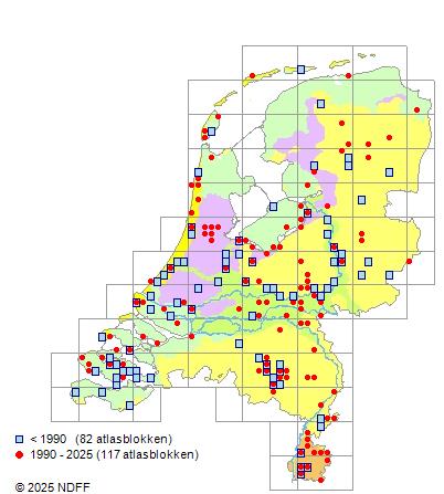 Het aantal atlasblokken (5x5 km) waarin de soort is gemeld binnen een periode van vijf jaar (vanaf 1980) of twintig jaar. Niet gecorrigeerd voor waarnemersinspanning en het aantal doorgegeven waarnemingen kan sterk variëren per periode, dus een trend in verspreiding kan hier niet direct uit worden afgelezen. Het opgegeven jaartal is het eerste jaar van de periode. Bron: gevalideerde waarnemingen uit de NDFF.