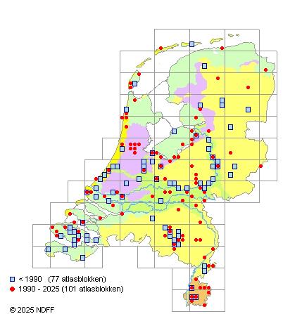 Het aantal atlasblokken (5x5 km) waarin de soort is gemeld binnen een periode van vijf jaar (vanaf 1980) of twintig jaar.