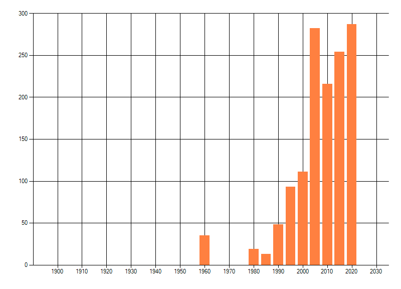 Het aantal atlasblokken (5x5 km) waarin de soort is gemeld binnen een periode van vijf jaar (vanaf 1980) of twintig jaar. Niet gecorrigeerd voor waarnemersinspanning en het aantal doorgegeven waarnemingen kan sterk variëren per periode, dus een trend in verspreiding kan hier niet direct uit worden afgelezen. Het opgegeven jaartal is het eerste jaar van de periode. Bron: gevalideerde waarnemingen uit de NDFF.
