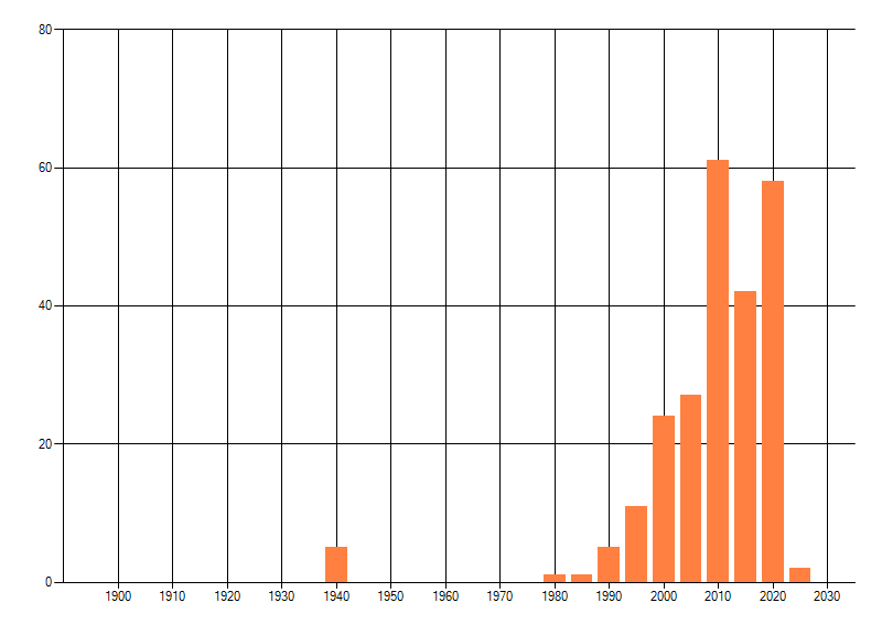 Het aantal atlasblokken (5x5 km) waarin de soort is gemeld binnen een periode van vijf jaar (vanaf 1980) of twintig jaar. Niet gecorrigeerd voor waarnemersinspanning en het aantal doorgegeven waarnemingen kan sterk variƫren per periode, dus een trend in verspreiding kan hier niet direct uit worden afgelezen. Het opgegeven jaartal is het eerste jaar van de periode. Bron: gevalideerde waarnemingen uit de NDFF.