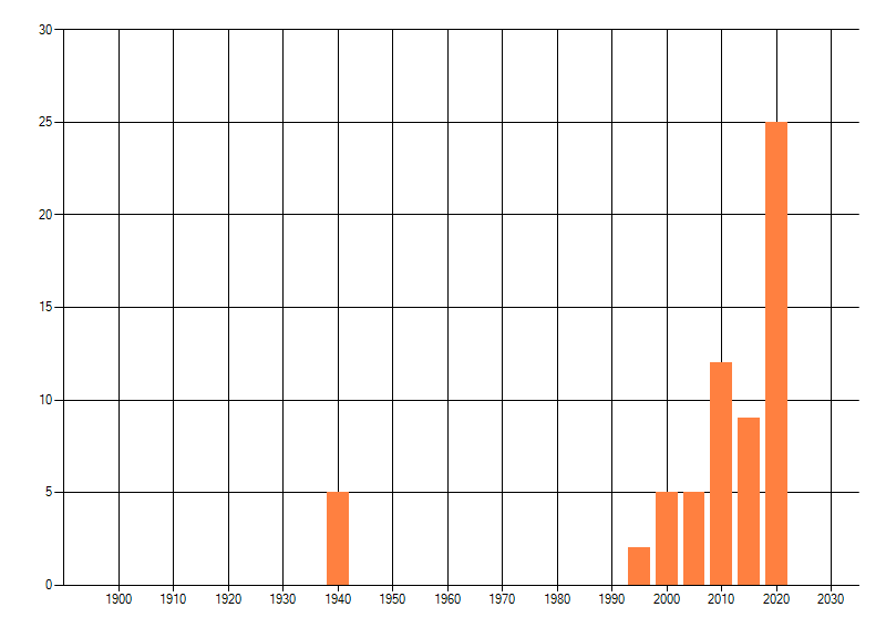 Het aantal atlasblokken (5x5 km) waarin de soort is gemeld binnen een periode van vijf jaar (vanaf 1980) of twintig jaar. Niet gecorrigeerd voor waarnemersinspanning en het aantal doorgegeven waarnemingen kan sterk variëren per periode, dus een trend in verspreiding kan hier niet direct uit worden afgelezen. Het opgegeven jaartal is het eerste jaar van de periode. Bron: gevalideerde waarnemingen uit de NDFF.