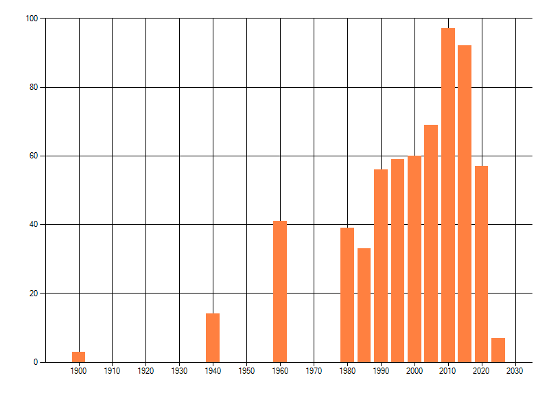 Het aantal atlasblokken (5x5 km) waarin de soort is gemeld binnen een periode van vijf jaar (vanaf 1980) of twintig jaar. Niet gecorrigeerd voor waarnemersinspanning en het aantal doorgegeven waarnemingen kan sterk variëren per periode, dus een trend in verspreiding kan hier niet direct uit worden afgelezen. Het opgegeven jaartal is het eerste jaar van de periode. Bron: gevalideerde waarnemingen uit de NDFF.