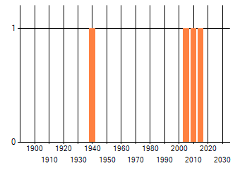 Het aantal atlasblokken (5x5 km) waarin de soort is gemeld binnen een periode van vijf jaar (vanaf 1980) of twintig jaar. Niet gecorrigeerd voor waarnemersinspanning en het aantal doorgegeven waarnemingen kan sterk variëren per periode, dus een trend in verspreiding kan hier niet direct uit worden afgelezen. Het opgegeven jaartal is het eerste jaar van de periode. Bron: gevalideerde waarnemingen uit de NDFF.