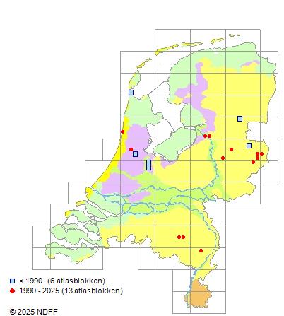 Het aantal atlasblokken (5x5 km) waarin de soort is gemeld binnen een periode van vijf jaar (vanaf 1980) of twintig jaar. Niet gecorrigeerd voor waarnemersinspanning en het aantal doorgegeven waarnemingen kan sterk variëren per periode, dus een trend in verspreiding kan hier niet direct uit worden afgelezen. Het opgegeven jaartal is het eerste jaar van de periode. Bron: gevalideerde waarnemingen uit de NDFF.