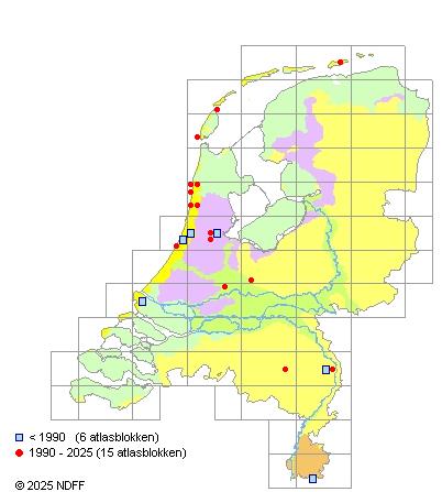 Het aantal atlasblokken (5x5 km) waarin de soort is gemeld binnen een periode van vijf jaar (vanaf 1980) of twintig jaar.