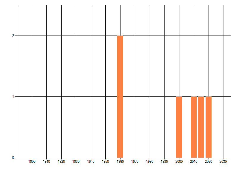 Het aantal atlasblokken (5x5 km) waarin de soort is gemeld binnen een periode van vijf jaar (vanaf 1980) of twintig jaar. Niet gecorrigeerd voor waarnemersinspanning en het aantal doorgegeven waarnemingen kan sterk variëren per periode, dus een trend in verspreiding kan hier niet direct uit worden afgelezen. Het opgegeven jaartal is het eerste jaar van de periode. Bron: gevalideerde waarnemingen uit de NDFF.