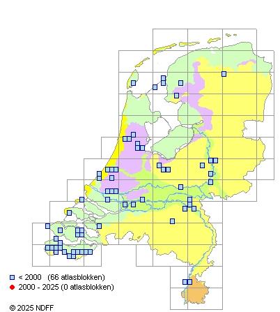 Het aantal atlasblokken (5x5 km) waarin de soort is gemeld binnen een periode van vijf jaar (vanaf 1980) of twintig jaar. Niet gecorrigeerd voor waarnemersinspanning en het aantal doorgegeven waarnemingen kan sterk variëren per periode, dus een trend in verspreiding kan hier niet direct uit worden afgelezen. Het opgegeven jaartal is het eerste jaar van de periode. Bron: gevalideerde waarnemingen uit de NDFF.
