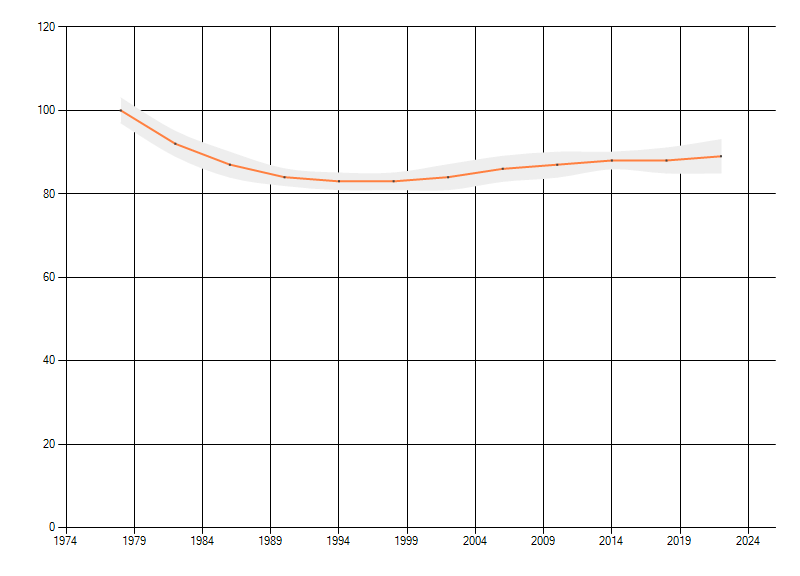 Gemiddelde trend van het aantal kilometerhokken waarin de soort voorkomt, weergegeven als indexcijfer (1975-1978 = 100).