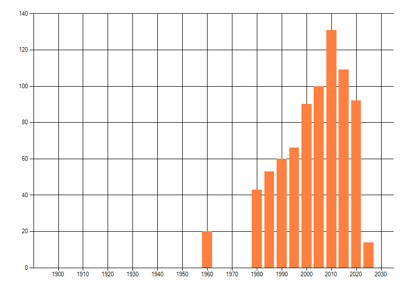Het aantal atlasblokken (5x5 km) waarin de soort is gemeld binnen een periode van vijf jaar (vanaf 1980) of twintig jaar. Niet gecorrigeerd voor waarnemersinspanning en het aantal doorgegeven waarnemingen kan sterk variëren per periode, dus een trend in verspreiding kan hier niet direct uit worden afgelezen. Het opgegeven jaartal is het eerste jaar van de periode. Bron: gevalideerde waarnemingen uit de NDFF.