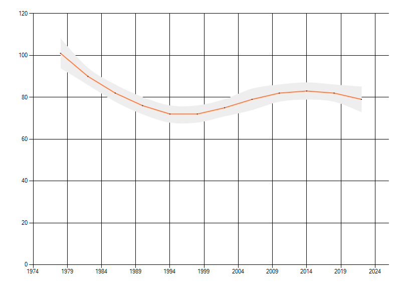 Gemiddelde trend van het aantal kilometerhokken waarin de soort voorkomt, weergegeven als indexcijfer (1975-1978 = 100).