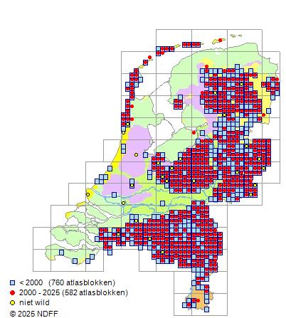 CC BY-NC-SA 3.0 NLVerspreidingNederlandVrij algemeen in het oosten en midden van het land, in Noord-Brabant, op de Waddeneilanden en in de kalkarme duinen van noordelijk Noord-Holland. Zeer zeldzaam in Zuid-Limburg en in de Zuid-Hollandse duinen.