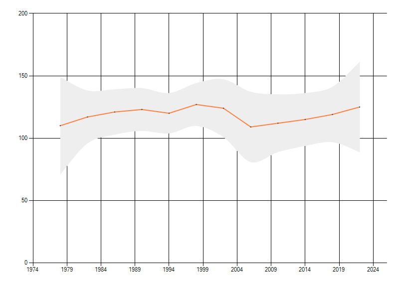 Gemiddelde trend van het aantal kilometerhokken waarin de soort voorkomt, weergegeven als indexcijfer (1975-1978 = 100).
