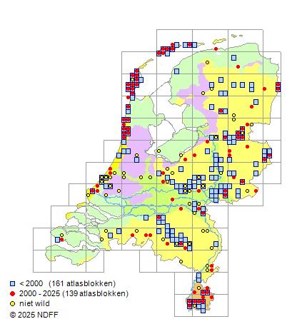 CC BY-NC-SA 3.0 NLVerspreidingNederlandVrij zeldzaam op Texel, Terschelling en Ameland, zeldzaam in Zuid-Limburg en de Hollandse duinen en zeer zeldzaam in het oostelijke rivierengebied, in Gelderland, Noord-Brabant en Oost-Nederland.