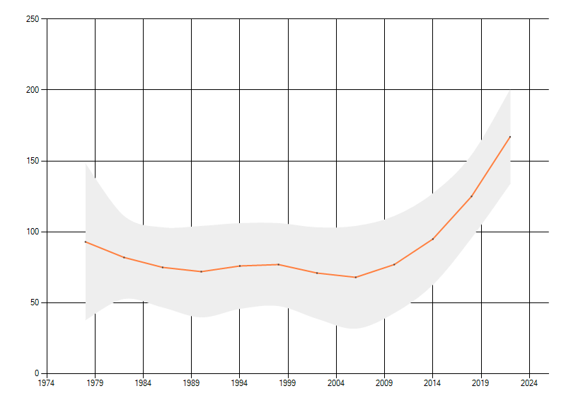 Gemiddelde trend van het aantal kilometerhokken waarin de soort voorkomt, weergegeven als indexcijfer (1975-1978 = 100). De trend is gecorrigeerd voor waarnemersinspanning en geeft de relatieve verandering in het aantal bezette kilometerhokken weer. Voor de berekening worden de data per periode van vier jaar samengenomen. In de grafiek correspondeert ieder punt met het laatste jaar van zo'n periode.